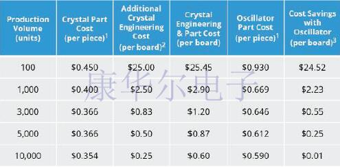 由于項(xiàng)目設(shè)計(jì)延遲而導(dǎo)致的機(jī)會成本未計(jì)入以下計(jì)算中,這在某些市場中可能是巨大的.在某些情況下,外部服務(wù)和測試會產(chǎn)生額外費(fèi)用,而這些費(fèi)用也可能是巨大的.此外,還有其他懲罰措施,例如,用于板子重新旋轉(zhuǎn)的附加材料/組件的成本,晶體所需的負(fù)載電容器的成本以及電容器所消耗的額外板子空間,所有這些都會使方程式更傾向于使用有源晶振.為簡單起見,在以下示例中,我們僅包括了計(jì)時(shí)組件的成本和糾正晶體問題的工程時(shí)間.