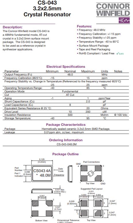 | CS-043-048.0M | Connor-Winfield | CS-043 | MHz Crystal | 48MHz | ±25ppm |